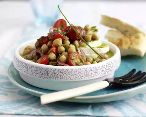 Pour the chickpeas into a sieve, rinse with cold water and drain well. Peel onions and cut them into fine rings. Wash, clean and halve or quarter the tomatoes. Wash chives, shake dry, put 4 stalks aside for garnishing.