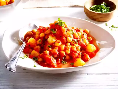 Peel, wash and chop the potatoes. Drain the chickpeas in a sieve. Wash and finely chop the chilli. Roast paprika powder and nutmeg in a pan, add ghee. Add the chilli, potatoes and chickpeas to the pan and fry, season with salt and pepper.