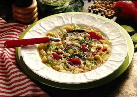 Wash the chickpeas, soak them overnight in 1 litre of cold water. Bring the chick peas to the boil with the soaking water and 1/2 litre of broth and simmer for about 30 minutes. In the meantime clean and wash the leek and white cabbage.