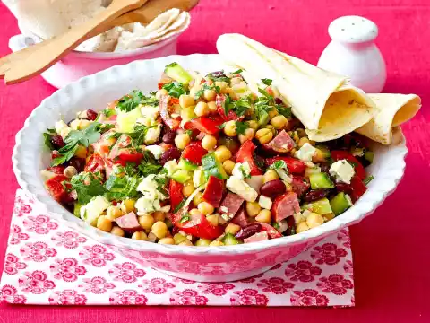 Put the chickpeas and beans in a large sieve, wash and drain well. Wash, clean and cut the tomatoes into pieces. Wash, clean and chop the cucumber. Also dice Kabanossi and Feta.