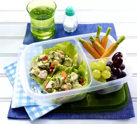 Pluck the leaves and chop them. Line a sealable container with lettuce. Arrange chicken salad on top, sprinkle with parsley. Grapes and carrots are delicious with it.