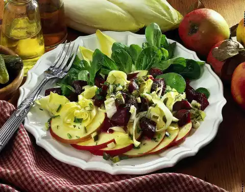 Arrange apple slices, chicory leaves and lamb's lettuce on 4 plates. Mix chicory, beetroot and gherkins and arrange on the salad plates. Pour vinaigrette over the salad and serve immediately.