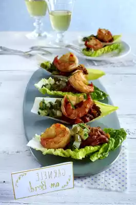 Clean the lettuce, carefully remove 20 beautiful leaves, wash and dab dry. Distribute on plates. Add some lentil bolognese and cucumber salsa to each salad leaf. Place the prawns on top. Cut the remaining chives into larger pieces.