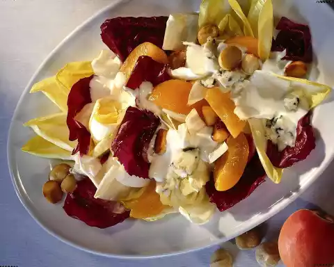 Remove the outer leaves from the chicory and radicchio. Halve each and cut out the stalk. Cut salad into bite-sized pieces. Mix salad and apricots with Roquefort sauce and arrange on a plate. Sprinkle with the nuts and remaining cheese