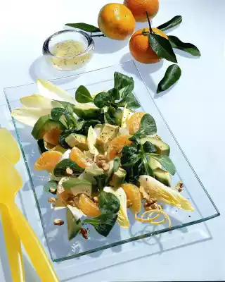 Remove the outer leaves from the chicory. Cut the chicory in half lengthwise and cut out the stalk. Cut the halves into strips. Sort lamb's lettuce, wash and drain. Peel the mandarins and divide into slices. Cut avocado in half, peel and remove the stone.
