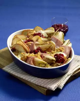 Cut out the core. Cut ham into 3 wide strips. Wrap one strip around each chicory. Melt 2 tablespoons of butter, add breadcrumbs and roast for 1-2 minutes until golden brown. Place the chicory and pear slices in an ovenproof dish. First pour sauce over them, then spread crumbs on top. Bake in the preheated oven (electric cooker: 200 °C/ convection oven: 175 °C/ gas: level 3) for 25-30 minutes. Spoon cranberries onto the casserole before serving