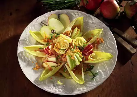 Cut the apple quarters into slices and sprinkle with lemon juice. Wash the chives, dab dry and cut into small rolls. Line 4 plates with whole chicory leaves in a star shape. Mix apples, chicory strips and lukewarm lentils, season to taste with salt, pepper and vinegar and arrange on the chicory leaves. Sprinkle with chives. Serve garnished with apple slices as desired