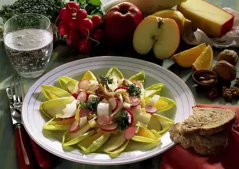 Clean and wash the chicory. Loosen the outer leaves and set aside. Cut the remaining chicory into strips. Clean, wash and slice the radishes. Dice cheese. Chop walnuts roughly.