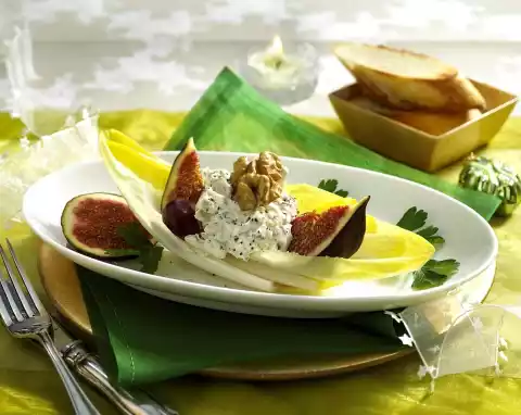 Add to the cream cheese mixture and stir in. Wash the grapes and pluck them from the stalks. Wash figs and dab dry. Remove chicory leaves, wash and dab dry. Place several leaves in opposite directions (shuttle look). Fill the chicory leaves with the cream cheese mixture. Place one shuttle on each plate. Quarter the figs. Serve the boat garnished with grapes, figs and parsley.