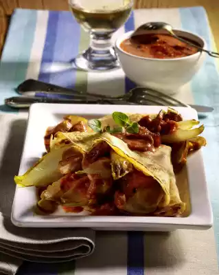 Bake 8 thin crêpes one after the other, keep warm. Heat 2 tablespoons of oil in a large pan. Fry the meat for about 5 minutes. Add the chicory and continue to fry for 2-3 minutes. Season with salt and pepper, remove and keep warm.