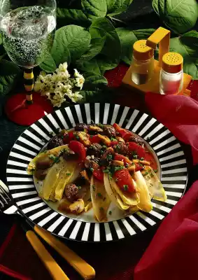 Season with salt and pepper and braise for about 5 minutes. In the meantime clean and wash the chicory and cut it in half lengthwise. Bring salted water and lemon juice to the boil in a small pot and cook the chicory for about 5 minutes.