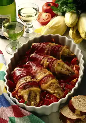 Wash the chicory, dab dry. Wrap first with cheese and then with ham slices. Place the chicory on the tomato cubes and season with coloured pepper. Cook in the preheated oven (electric cooker: 200 °C/ gas: level 3) for about 20 minutes