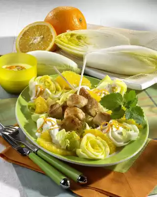 Wash orange hot, rub dry. Peel off some of the peel in fine strips. Peel the orange so that the white skin is completely removed. Cut the orange into slices, catching the juice. Clean and wash the chicory and remove the stalk. Chop the chicory finely