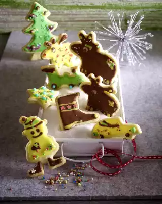 Cover the dough and chill for about 30 minutes. On a floured work surface, roll out approx. 2 mm thin and cut out various shapes (e.g. moose, locomotives, stars, Santa Clauses, boots and cars). Knead the remaining dough again and cut out further motifs. Spread on 2 baking trays lined with baking paper. Bake one after the other in a preheated oven (electric cooker: 175 °C/ convection oven: 150 °C/ gas: level 2) for 15-20 minutes. Take out and let cool down. Mix icing sugar and lemon juice to a glaze, spread on 3 bowls. Colour 2 parts of the icing with yellow and green. For the dark chocolate icing, chop the chocolate and melt over a warm water bath.