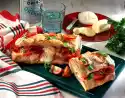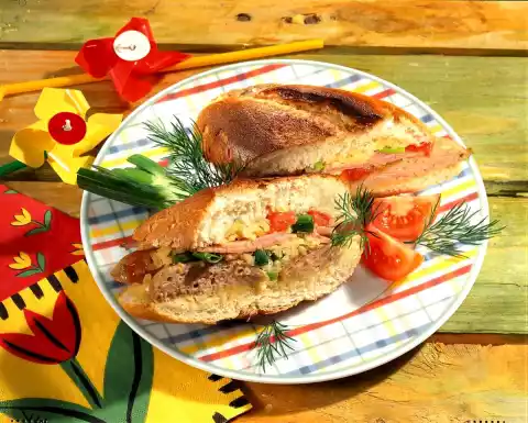 Assemble the baguette roll. Bake in the preheated oven (electric cooker: 225 ° C/ gas: level 4) for approx. 5 minutes. Serve the baguette diagonally cut through, garnished with tomato and fresh herbs.