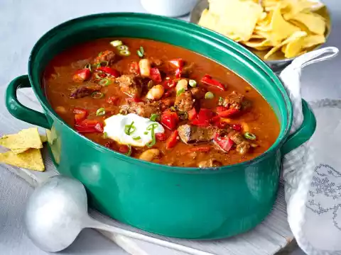 Cook the beans for the last 10 minutes in the goulash. Clean and wash the spring onions and cut them into rings. Mix sour cream and spring onion rings, except for a handful for sprinkling. Season to taste with salt and pepper and spill on the stew just before serving. Spread the remaining spring onion rings over the stew. Tortilla chips taste good with it.