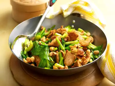 Roast the cashew nuts in a wok or large pan without fat until golden brown. Take them out. Heat the oil in the wok. Fry the meat in it in portions until golden brown all around. Season with salt and take out.