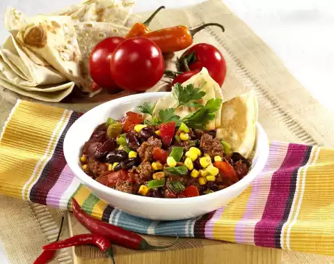 Stir from time to time. Drain beans and corn on a sieve and add to the chili. Season chili con carne with salt and pepper to taste. Put the chili on plates and serve garnished with parsley and chillies.