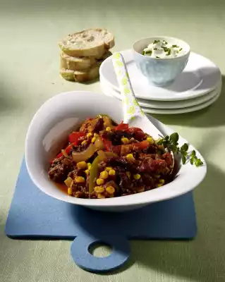 Season with salt, chili, oregano and garlic. Drain corn and beans, rinse and drain. Add the vegetables to the mince and fry for another 8 minutes. After 4 minutes stir in tomatoes and chop them coarsely with a spatula.