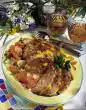 Clean, wash and cut the peppers into strips. Peel onions and cut them into strips. Wash the oregano, dab dry, except for a little to garnish, pluck off the leaves and chop.