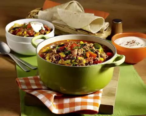 Cover and simmer at low heat for 25-30 minutes. Drain corn and kidney beans. Rinse beans and drain well. Add to the chili and warm up with it. Season again with salt and paprika. Wash parsley, dab dry and cut into strips. Sprinkle over the chilli. Sour cream and tortilla flat cakes taste good with it