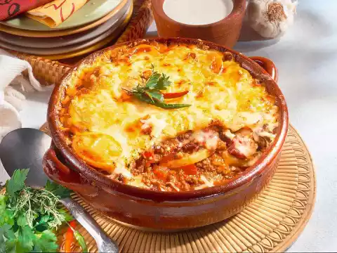 Add the beans to the mince for about the last 5 minutes of cooking time. Grate cheese roughly. Spread a casserole dish (approx. 2 litres capacity) with remaining oil and line the bottom with 1/3 of the potatoes. Spread half of the chili con carne on top and sprinkle with half of the cheese. Spread another third of the potatoes on top. Spread with the remaining chili con carne, cover with the remaining potatoes and sprinkle with the remaining cheese. In a preheated oven (electric cooker: 175 °C/ gas: level 2)