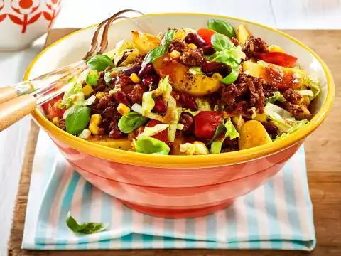 Quarter the potatoes. Mix with minced meat, remaining salad ingredients and dressing. Season to taste with salt and pepper.