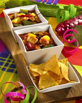 Add chicken cubes and heat for about 5 minutes. Arrange chili con chicken in small bowls. Tortilla chips taste good with it.