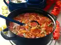Peel and finely dice the onion and sauté in the frying fat until golden brown. In the meantime, peel and wash the potatoes and cut them into medium-sized pieces. Dust onion with paprika and add tomato paste. Add tomatoes, potatoes, chilli and bay leaf and simmer for about 20 minutes.