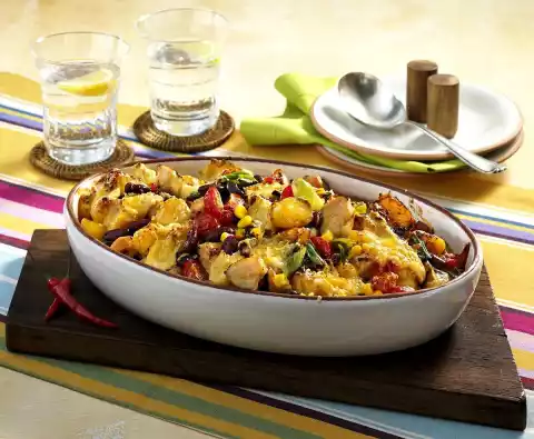 After 5 minutes add potatoes. Season with salt and pepper. Fold in tomatoes, onions, beans and corn. Add chilli sauce and stock and bring to the boil. Pour into a greased casserole dish. Sprinkle with cheese and bake in a preheated oven (electric cooker: 200 °C/ convection oven: 175 °C/ gas: level 3) for approx. 15 minutes