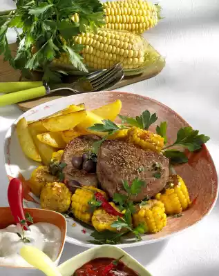 Fry the steaks in 1 tablespoon of oil from each side. Season with salt, pepper and thyme. Fry for 3-6 minutes as required. Melt butter. Fry the corn on the cob briefly. Season with chilli.