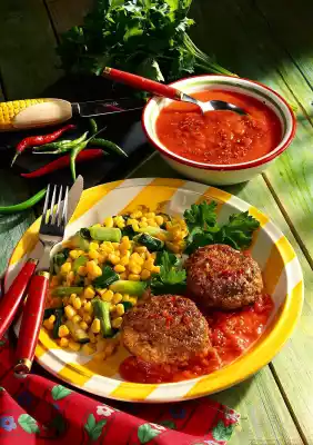 Dice the white spring onion shafts and sauté in the remaining oil. Add the tomatoes and bring to the boil. Season to taste with salt and pepper. Cut remaining chilli pepper into fine rings. Arrange 2 meatballs each with the vegetables and some sauce on a plate.