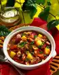 Add the tomato juice and pieces, some salt, vegetable stock and half of the chili rings. Bring to the boil and simmer for about 10 minutes. Finely dice remaining onion and knead with minced meat, remaining garlic, chili and a little salt and pepper.