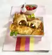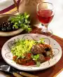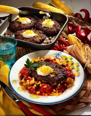 Heat 2 tablespoons of oil (e.g. in a grill pan). Fry the steaks for 5-7 minutes on each side. Season vegetables with salt, pepper and sugar. Serve with steaks. Put 1 tsp. crème fraîche and 1 tsp. cheese on each steak. Garnish with parsley. Served with: French fries