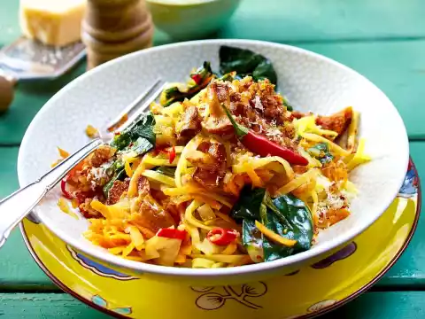 Add the noodles to the vegetables in the pan, mix and heat briefly. Season again with salt and pepper. Arrange on plates sprinkled with breadcrumbs and remaining Parmesan cheese. Garnish with chilli peppers as desired.