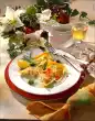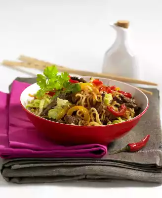 Peel and finely dice the onion, garlic and ginger. Clean and wash the peppers and Chinese cabbage. Dab meat dry. Cut everything into strips