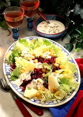 Mix yoghurt and lemon juice. Crush the coriander. Season yoghurt marinade with salt, pepper and coriander. Arrange the salad ingredients on a plate, sprinkle croutons and chives on the salad, add some marinade to the salad and add the rest of the marinade.