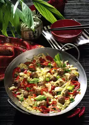 Add prepared vegetables and chilli pepper. Braise briefly and add stock and some soy sauce and bring to the boil. Braise over medium heat for about 5 minutes. Season to taste with salt and soy sauce.