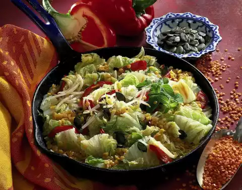 Add lentils, pour on broth and cook for about 10 minutes. Fold in pumpkin seeds. Rinse sprouts cold and let them drain. Add to the vegetables shortly before the end of the cooking time. Season Chinese cabbage pan with salt, pepper and oregano. Garnish as desired with fresh oregano