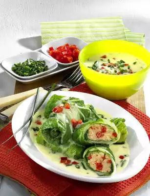 Spread Chinese cabbage leaves on a clean tea towel and let them drain. Cut the leaf stalk a little flatter. Lay 2 leaves half overlapping next to each other and add a tablespoonful of filling. Roll up the filling firmly and pin it with a wooden skewer. Heat 30 g fat in a large pot and sauté the flour in it. Add 250 ml stock and milk while stirring, bring to the boil and simmer for about 2 minutes. Wash the chives, dab dry and cut into fine rolls, except for 2 stalks. Stir the chives into the sauce except for a little bit for sprinkling and season with salt and pepper. Place the Chinese cabbage rolls in the sauce, cover and stew on a low heat for 8-10 minutes. Arrange the rolls with the sauce on a deep plate and sprinkle with remaining diced peppers and chives. Serve garnished with chives