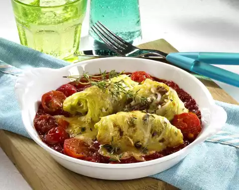 Bring to the boil, season with salt, pepper, paprika and sugar. Divide the sauce into four ovenproof dishes (1 per person) or a large casserole dish. Put the cabbage rolls in it, sprinkle with cheese.