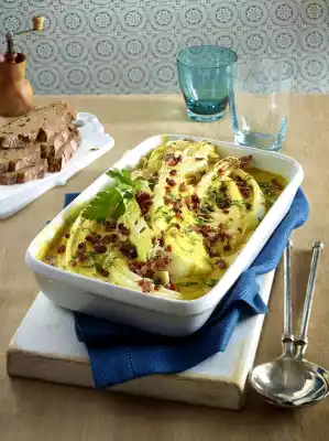 Put the cabbage slices into an ovenproof casserole dish, pour the sauce evenly over them. Sprinkle with cheese and ham. Bake in a preheated oven (electric cooker: 200 °C/ convection oven: 175 °C/ gas: see manufacturer) for 15-18 minutes.