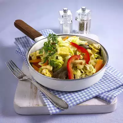 Add the diced tofu and cashew nuts to the pan and warm up again. Garnish the Chinese cabbage tofu pan with parsley.