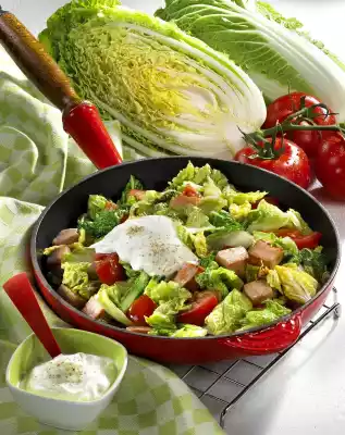 Add onion and cabbage and braise for 5 minutes. Fold in the tomatoes. Season to taste with salt and pepper. Mix crème fraîche and season with pepper. Put some crème fraiche on the cabbage. Add the rest of the crème fraiche extra and serve