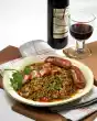 Cut the cured pork into cubes. Peel and finely chop the onion. Clean and wash the cabbage and cut into wide strips. Clean, wash and cut tomatoes into pieces. Heat oil in a large pan. Brown the meat in it.