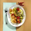 Wash parsley, dab dry and chop. Sprinkle over the vegetables. Drain the potatoes. Arrange Chinese cabbage vegetables and potatoes on a plate.