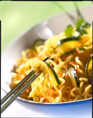 Peel and wash the carrots. Wash and clean the zucchini. Cut the vegetables lengthwise into slices on a bread or slicing machine, then lengthwise into approx. 1 cm wide strips. Cook pasta in boiling salted water for 4-5 minutes.