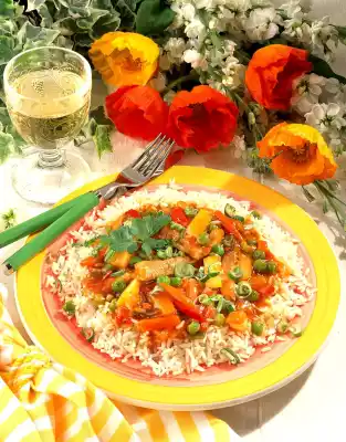 Cook the rice in boiling salted water for about 20 minutes. In the meantime defrost peas. Clean, wash and cut spring onions into rings. Drain the pineapple and collect the juice. Cut the fruit flesh into small pieces. Wash flesh, dab dry, cut into thin strips. Fry in hot oil over high heat for 3 minutes while turning.