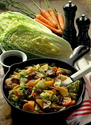 Dab the fillet of beef dry, then cut into thin strips. Drain bamboo shoots and cut into slices. Wash and halve the Chinese cabbage and cut into wide strips. Peel carrots, wash and cut into very thin slices.