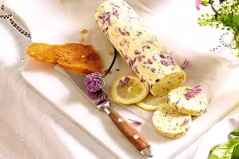 Wash 8 chive blossoms, dab dry well and chop finely. Mix 250 g soft butter with chive blossoms and grated rind of 1 organic lemon. Season to taste with salt and pepper. Form butter into a roll using cling film and chill for about 2 hours.